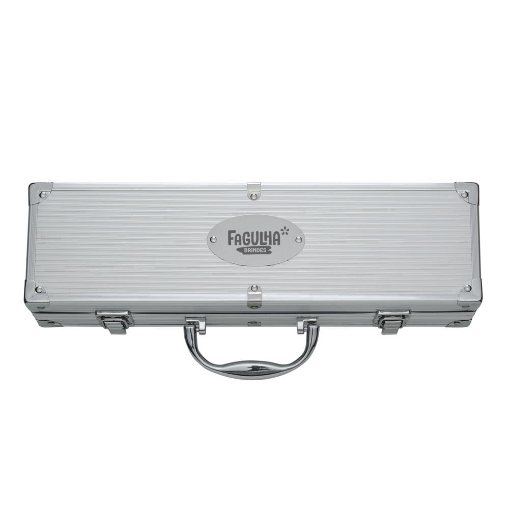 Kit churrasco 4 peças em maleta de alumínio com travas de segurança, contém: espátula, pegador, garfo e faca em inox. Parte interna da maleta com revestimento em tnt e suportes de velcro para fixação das peças.
