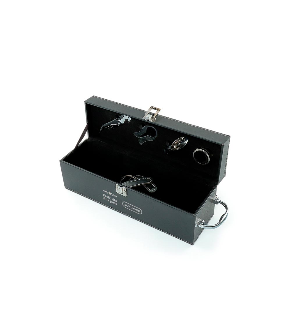 Kit Vinho 4 peças em maleta de couro sintético. Contém saca-rolhas metálico, bico condutor com tampa, cortador de lacre e wine colar. Maleta com alça, trava de segurança e parte interna revestida de veludo com área de acomodação para garrafa.
